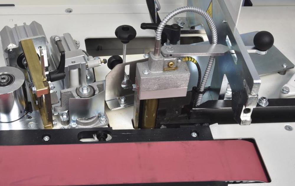 The glue is heated rapidly and evenly by the resistances. The automatic lowering of the glue temperature after a temporary halt in production when using the machine avoids burning of the glue. A new innovative system of self-lubrication of the glue pot, allows a more extensive use of the edge banding machine without the necessity of lubrication. Two rollers press the edge banding evenly and efficiently on to the panel edge. The glue spreading roller with electrical resistance inside provides a uniform glue spread and always at the maximum working temperature even on panels at the maximum working height.